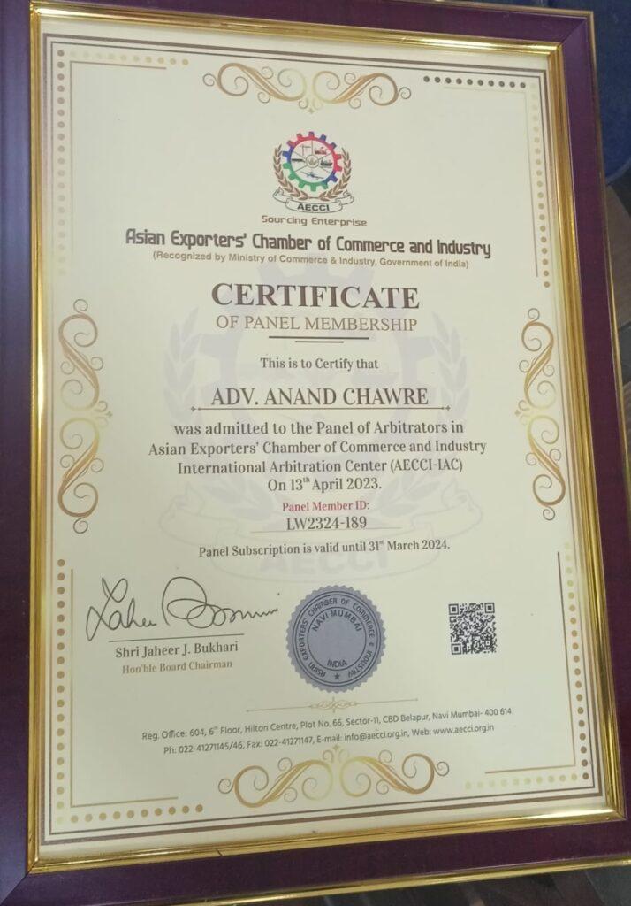 Adv Anand Chawre Sir empanelled as an Arbitrator on the Panel of Arbitrators by the Asian Exporters' Chamber of Commerce and Industry with effect from 23.04.2023.